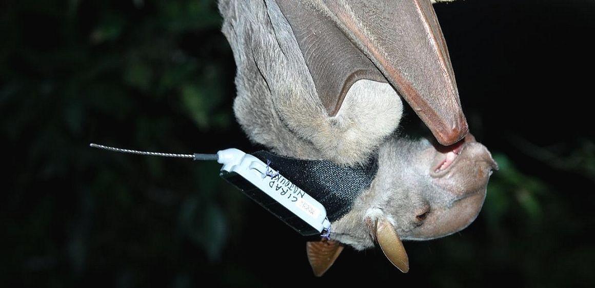 Chauve souris Hypsignathus monstrosus équipée d’une balise GPS pour étudier le comportement de cette espèces © M. Labadie