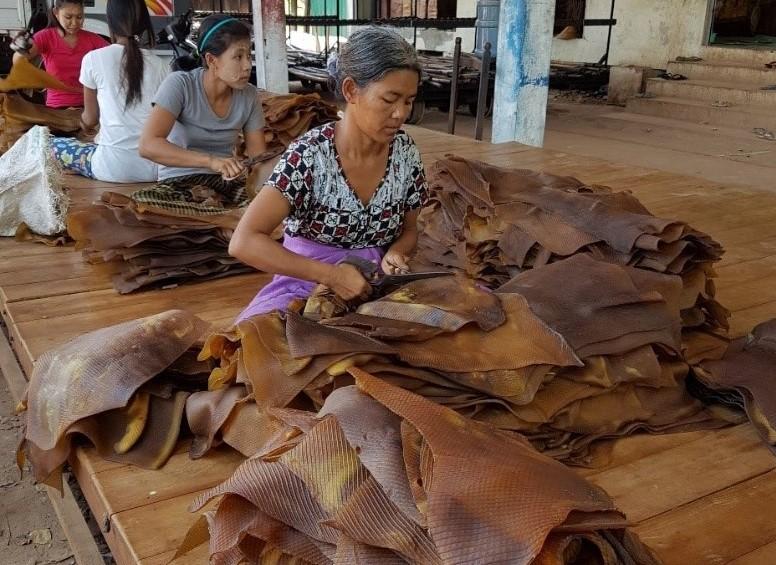 Contrôle manuel de chaque feuille de caoutchouc avant la vente par l’élimination des impuretés dans une usine de l’Etat de Mon © B. Chambon, Cirad