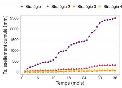 En utilisant des placettes de 1 m2 au sein des différentes parcelles, les chercheurs ont suivi pendant 3 ans le ruissellement et le détachement de sol. Les éléments minéraux contenus dans l’eau de ruissellement et le sol détaché ont été analysés afin de quantifier la perte de fertilité du sol selon les différentes stratégies. Les résultats montrent qu’à la fin du suivi, la première stratégie entraîne une érosion du sol extrêmement élevée. La stratégie n°2 permet une réduction de 88 % du ruissellement et de 98 % des pertes de sol par rapport à la stratégie n°1. Les stratégies n°3 et 4, avec résidus d’abattage et légumineuses combinés, aboutissent à une suppression quasi-totale de l’érosion. La restitution plus importante de résidus de culture dans la stratégie n°4 ne permet pas une meilleure protection contre l’érosion que la stratégie n°3. Au contraire, les pertes d’éléments minéraux dans l’eau de ruissellement et le sol détaché y sont plus élevées en raison d’une décomposition rapide de la matière organique.
