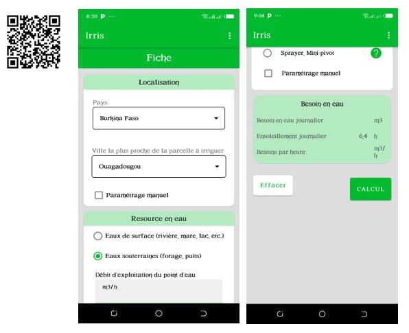 Ecrans de saisie de l’application IRRIS et QR Code pour son téléchargement. © PRACTICA Foundation