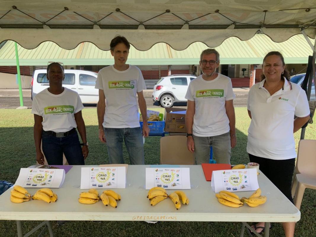 Différentes en goût des variétés locales habituellement consommées, ces quatre variétés sont actuellement évaluées, à la fois pour leur intérêt agronomique et commercial dans le cadre des projets DIVAC («Développer et transférer des Innovations Variétales en réponse à la lutte contre la Cercosporiose noire aux producteurs de bananes dessert destinées aux marchés locaux et export») et AMIQUAL («Améliorer la conservation et la qualité post-récolte des fruits en prenant en compte les demandes sociétales et les nouvelles contraintes réglementaires») financés par le FEADER et la Région Guadeloupe. Ces variétés innovantes issues du programme d’amélioration variétale du Cirad ont été sélectionnées pour leur résistance aux cercosporioses et pour leurs caractéristiques adaptées à la filière antillaise de production et de commercialisation. Depuis le début du projet, courant 2021, plusieurs parcelles ont été plantées chez et sur la station expérimentale du Cirad. Ces parcelles sont actuellement en 1er cycle et les récoltes des premiers fruits ont débuté. La journée du Bik Agr’Innov a été l’occasion de faire gouter ces variétés à un large public qui ont été très appréciées avec une légère préférence pour deux d’entre elles. Ces dégustations sont à poursuivre.
