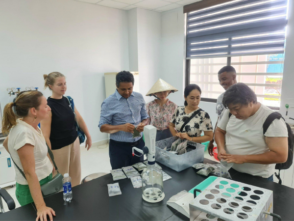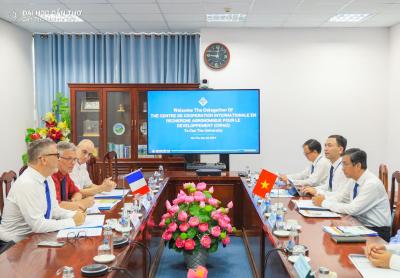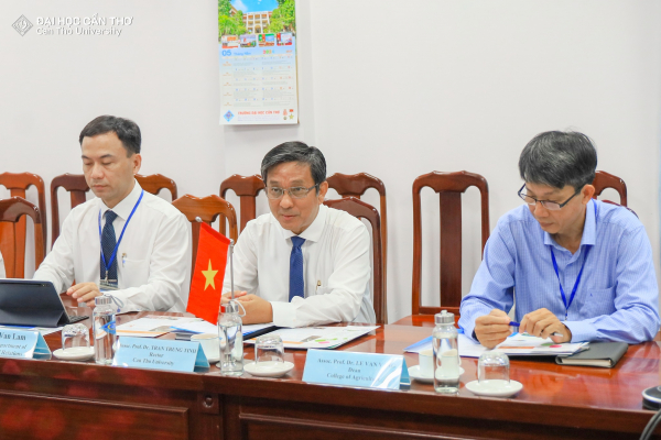 Le Cirad, avec la présence de Dr. François Roger, directeur régional pour l'Asie du Sud-Est continental, Dr. Martijn TEN HOOPEN, directeur adjoint du département BIOS (Systèmes Biologiques), et Dr. Pierre Lefeuvre, chercheur au Cirad (BIOS PVBMT) et à la faculté d'agriculture de la CTU, a été chaleureusement accueilli par le recteur et les professeurs de l'Université de Can Tho. © Université de Can Tho.