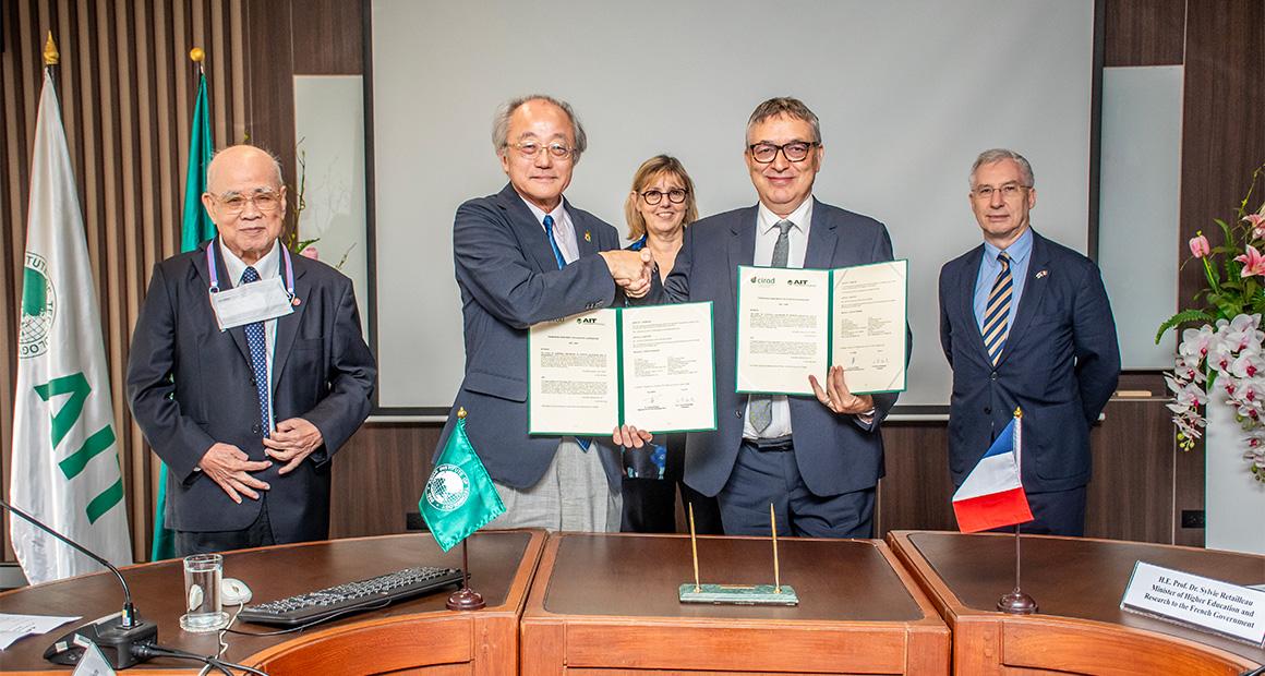 Signature du MoU Cirad - AIT par Dr François Roger, CIRAD, et le Président Yamamoto, AIT, en présence de S.E. Prof. Dr. Sylvie Retailleau, Ministre française de l'Enseignement supérieur, de la Recherche et de l'Innovation et S.E. M. Jean-Claude Poimboeuf © AIT, 2023