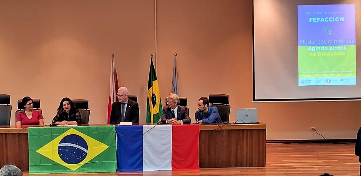 Organisé en partenariat avec l’Université Fédérale du Pará (UFPA), partenaire scientifique important de l’IRD et du Cirad pour la recherche en Amazonie, le lancement du projet FEFACCION a eu lieu ce lundi 03 juin à Belém, ville hôte de la 30ème conférence de l’Organisation des Nations Unies sur les changement climatique (COP30) en novembre 2025. Accueilli à l’Institut National de Recherche Spatiale (INPE), la cérémonie de lancement a commencé par les discours d’ouverture de Sophie Jacquel, Conseillère adjointe de coopération et d’action culturelle de l’Ambassade de France, de l’Ambassadeur de France au Brésil, Emmanuel Lenain, de la Rectrice de l’Université Fédérale Rurale d’Amazonie (UFRA), Herdjania Vera Lima et du Recteur de l’Université Fédérale du Pará, Emmanuel Tourinho. Lors de son discours, monsieur l’ambassadeur a souligné l’importance de ce projet structurant qui s’aligne avec le nouveau plan d’action du partenariat stratégique France-Brésil signé en mars dernier par le président du Brésil Luiz Inácio Lula da Silva et le président de la France Emmanuel Macron. A son tour, le Recteur de l’UFPA a rappelé l’importance de permettre le partage des connaissances entre Etats Amazoniens grâce à des initiatives telles que le Centre Intégré de la Sociobiodiversité d’Amazonie (CISAM) qui regroupent 13 universités des Etats d’Amazonie ou le projet FEFACCION qui regroupe plus de 30 partenaires brésiliens. Après la cérémonie d’ouverture, Sophie Jacquel a présenté le projet et ses objectifs aux partenaires présents.