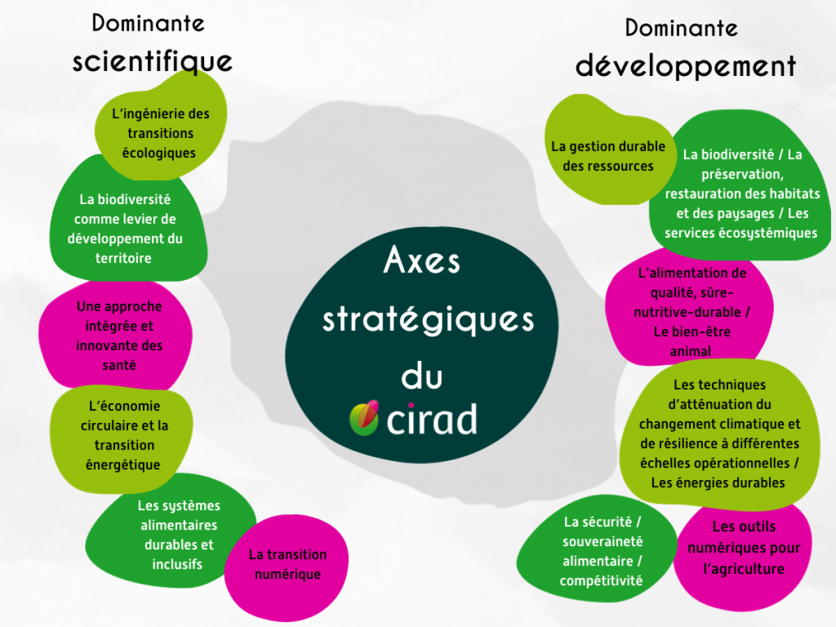 A travers des axes stratégiques à dominante scientifique et de développement, le Cirad couvre de nombreux champs thématiques dont le but d’un développement durable du territoire.