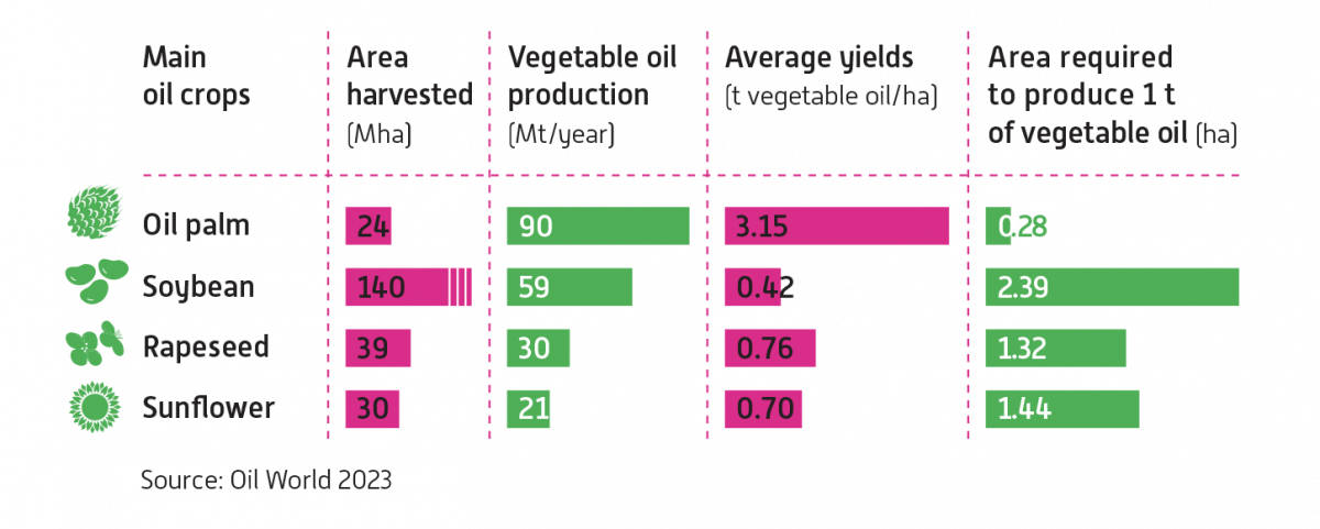 Palm oil has a bad reputation, and for good reason. Vast expanses of monoculture plantations, with oceans of palms, have resulted in deforestation and ecosystem degradation. However, palm plantations are actually more land-efficient than other oilseed crops. It takes an average of 0.28 hectares of oil palm to produce one tonne of vegetable fat, compared to 2.39 hectares for soybean and 1.32 for rapeseed.