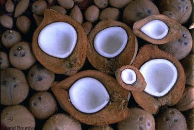 The nuts comprise a smooth epidermis whose colour depends on the variety and the stage of ripening, covering a thick fibrous layer, known as the "husk". It is this fibrous layer that covers the actual seed: a nut with a very hard shell. The shell surrounds the albumen, an oil-bearing kernel of varying thickness. It also contains a sterile liquid known as "coconut water". This is the nut's fresh water reserve, which enables it to germinate regardless of the outside conditions: salt water, deserted beaches, etc, provided the temperature is right, obviously. Two varieties, the Macapuno from the Philippines and the Kopyor from Java, do not produce albumen but a jelly that completely fills the nut. Their nuts are highly sought after for making desserts.