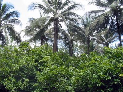 Coconut palms are often grown with other crops such bananas, cloves or cocoa, not forgetting all the different food crops traditionally grown locally. Near dwellings, it provides shade for growing vegetables and medicinal plants.