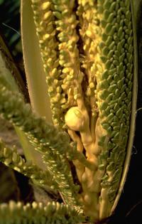 The inflorescences comprise spikelets bearing female flowers at the base and male flowers towards the tip. The fruits, which develop in the axil of each frond, are known as drupes, or more commonly "coconuts".