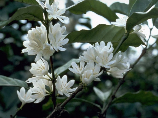 Several times a year, particularly at the end of the dry season, coffee trees are covered in very strongly scented white flowers that grow in the leaf axils. The flowers are pollinated by insects and the wind. The short-lived flowers fade directly after pollination, becoming fruits after two to three months. They are then replaced by other flowers.
