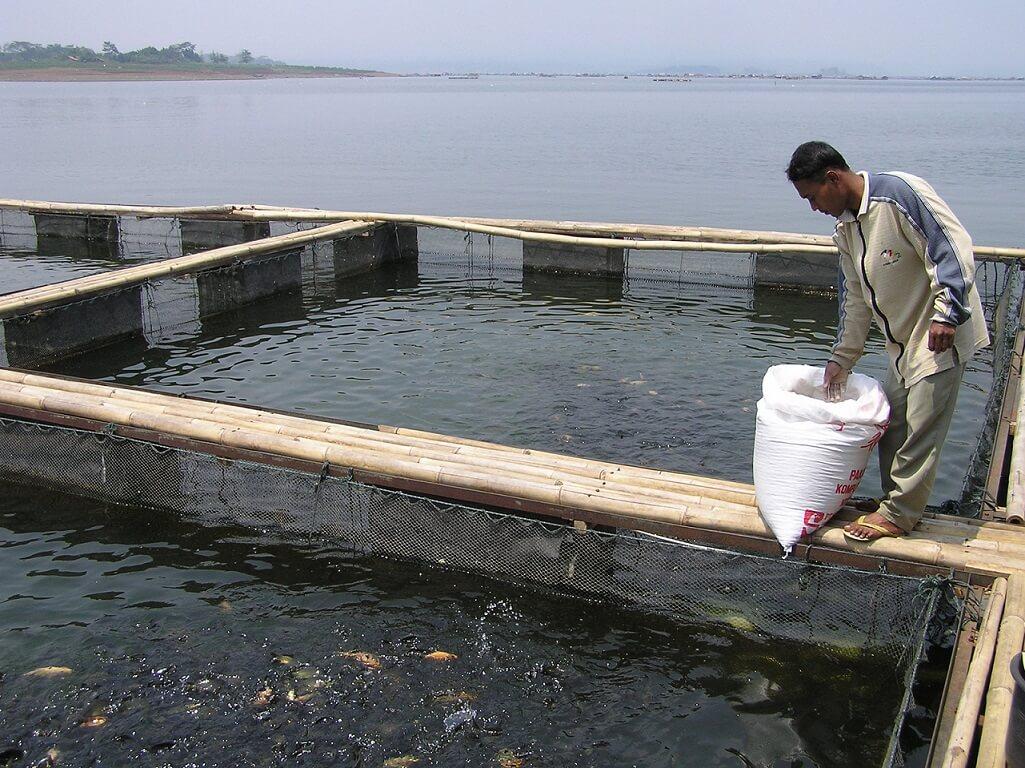 Feeding fish in floating cages in Indonesia (Lake Cirata). Indonesia has a high antimicrobial resistance index (0.355), which is a health threat to its fish farms © M. Legendre, IRD