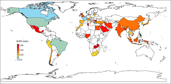 Map showing multi-antibiotic resistance worldwide. The index is calculated by determining the ratio between the number of antibiotics to which an isolate is resistant and the total of antibiotics to which it was exposed (an index >0.2 indicates high antibiotic contamination).