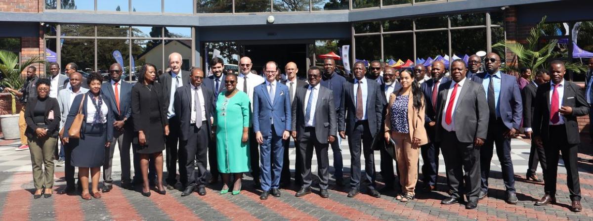 Official ceremony for the handover of the Biotechnology Centre to the University of Zimbabwe. Front row (L to R): Paul Mapfumo, Vice Chancellor of the University of Zimbabwe; Paul Mavima, Minister of Skills Audit and Development ; Paul-Bertrand Barets, French Ambassador to Zimbabwe © L. Serpaud, French Embassy in Zimbabwe