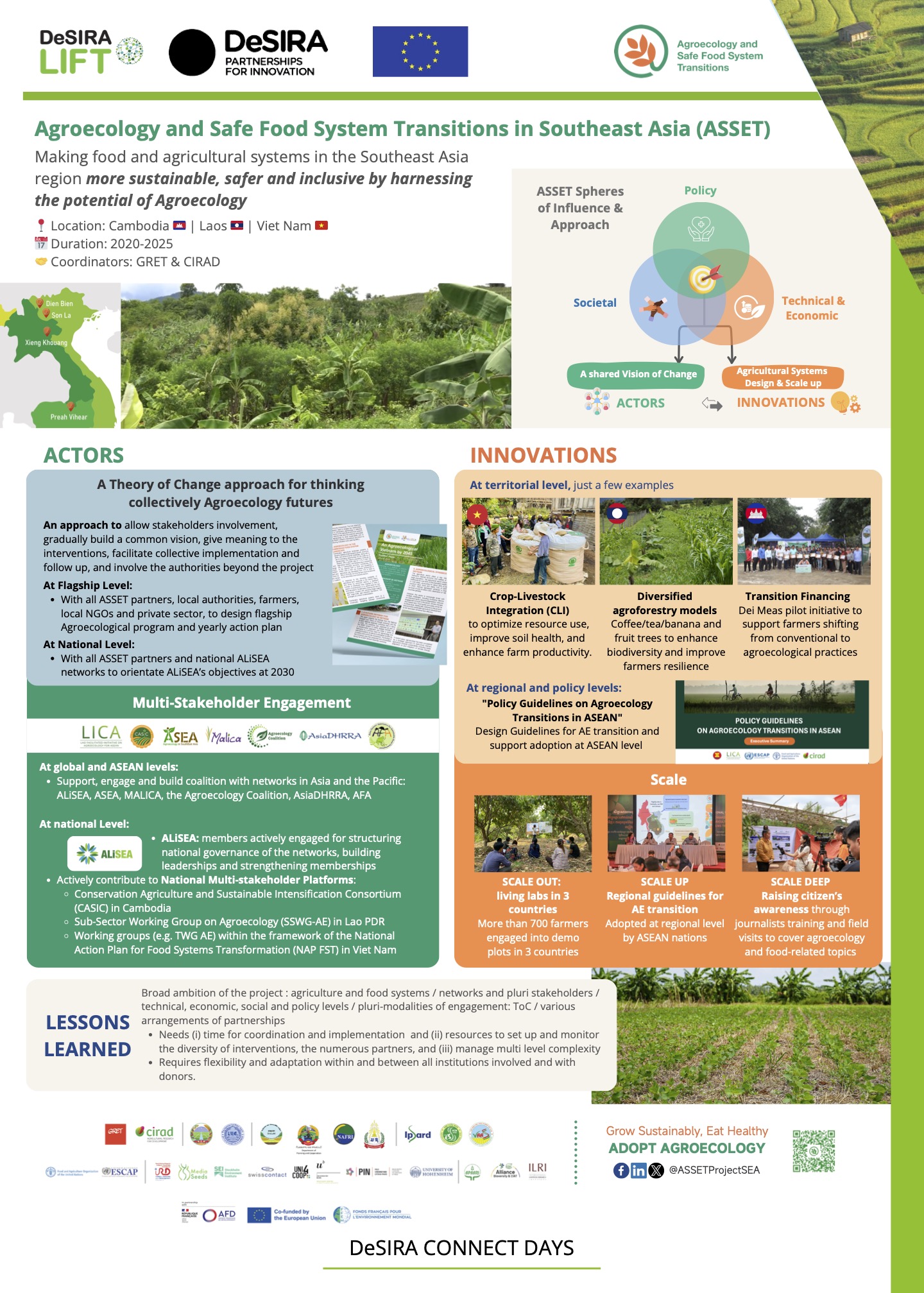 - The ASSET project: In Cambodia, Laos, and Vietnam, researchers focus on integrating agroecological practices into food systems to improve sustainability, safety, and inclusiveness. Notable achievements include developing regional policy guidelines for agroecology transitions, piloting agroforestry and integrated farming models, and fostering multi-stakeholder engagement through national and regional platforms.