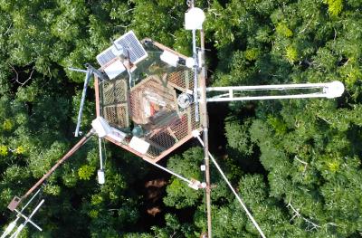 The second main image, provided by Dr. J. Sathornkich, Kasetsart University, highlights the work of the Hevea Research Platform in Partnership (HRPP) on sustainable rubber production. This photograph was taken at the Chachoengsao site, a pioneering location established in 2006, where instruments are mounted on a 25-meter-high tower above the rubber tree canopy.
