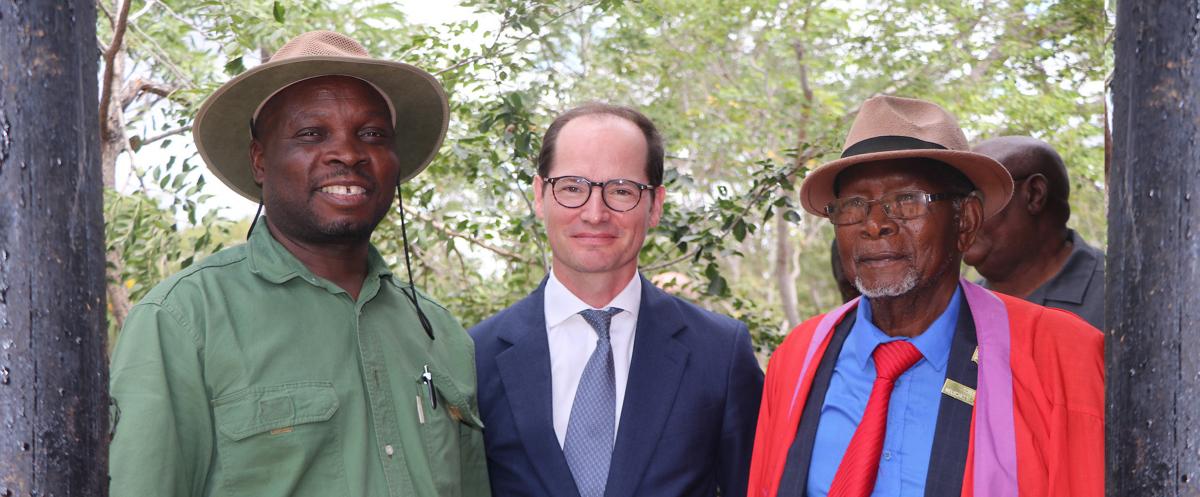 From left: Matabeleland North Minister of State for Provincial Affairs and Devolution, Hon. Richard Moyo; French Ambassador to Zimbabwe, H.E. Mr. Paul Barets; and Chief Nelukoba Dingani at the launch of the Community Knowledge Hub and Mobile Exhibition. ©CIRAD, Martha Katsi