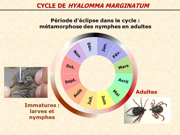 Les tiques adultes se fixent sur chevaux, bovins, ovins, caprins, sangliers, chevreuils, sans présenter de danger pour eux autres que de petites blessures quand l’infestation est trop importante. Après s’être gorgée du sang de leur hôte, les tiques femelles se détachent, tombent au sol et pondent dans l’environnement. De début juillet à fin septembre, les larves issues des œufs se fixent sur des petits mammifères (notamment lièvres et lapins), des oiseaux (notamment merles mais aussi grives, rouges-gorges, pinsons...). Une fois gorgée, la larve se métamorphose sur l'hôte en nymphe qui se gorge à son tour, puis se détache trois semaines après la fixation de la larve.