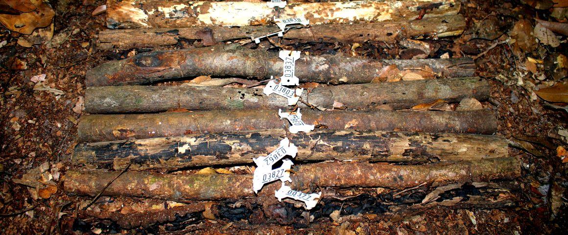 Des échantillons de bois ont été placés dans des cages à l'abri des insectes, au milieu des sites étudiés, afin de quantifier leur contribution à la décomposition du bois. Ici, site expérimental du Cirad à Paracou, en Guyane. © J. Beauchêne, Cirad