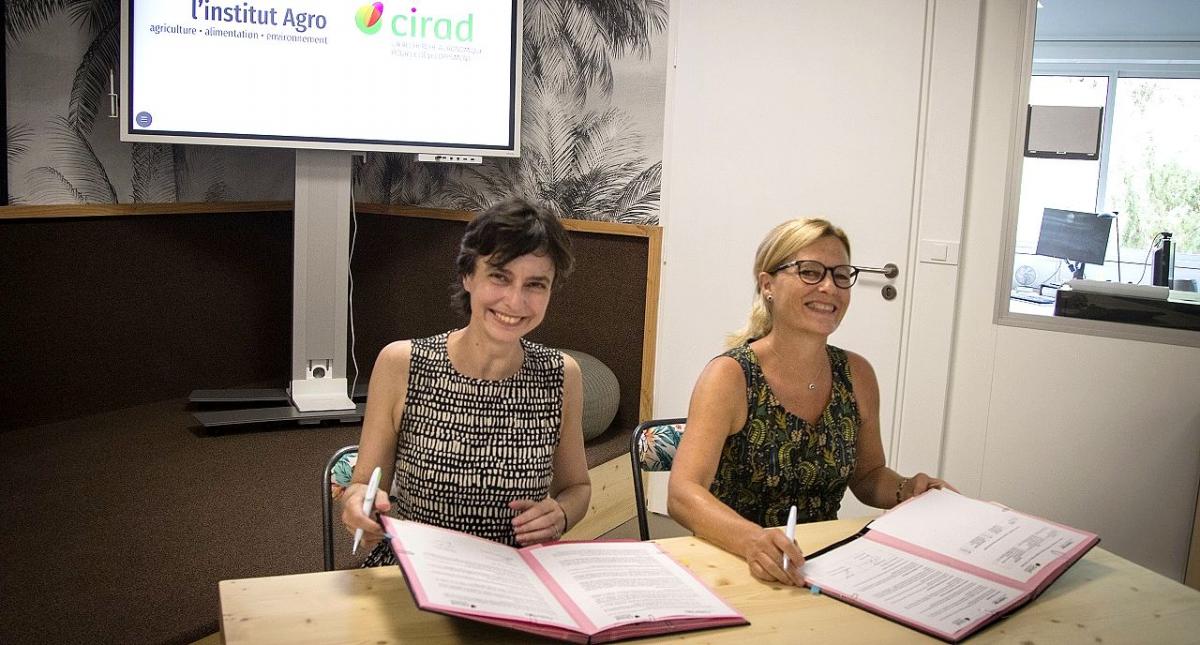 Lundi 12 juillet 2021, Elisabeth Claverie de Saint Martin (à gauche) et Anne-Lucie Wack (à droite) ont signé un accord qui vise à intensifier la coopération entre le Cirad et l'institut Agro dans les domaines de la formation © C. Cornu, Cirad