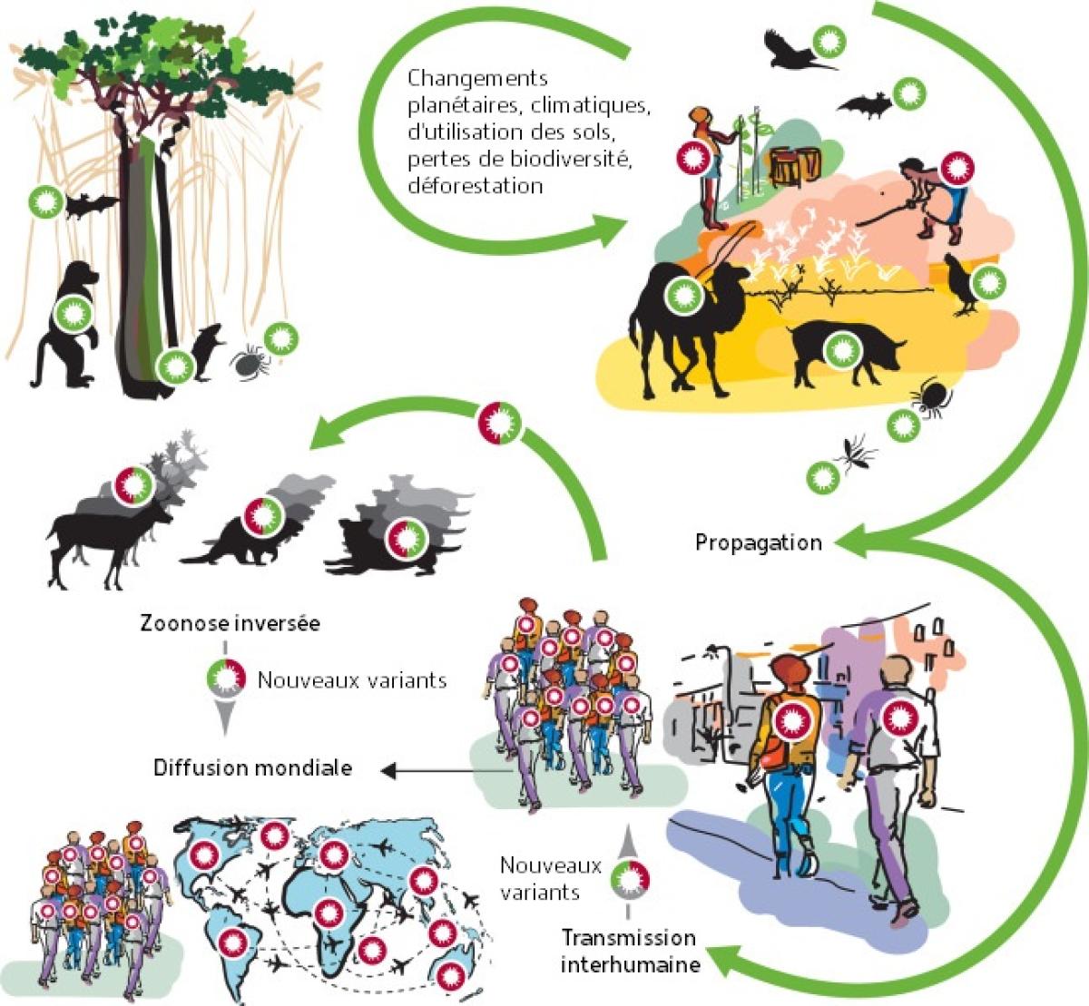Comme 75 % des maladies émergentes, la covid-19 est probablement une zoonose, une maladie qui se transmet des animaux aux humains. Pour faire face à ces risques sanitaires, les scientifiques développent depuis des années des approches globales de la santé, basées sur les interconnexions et les équilibres en santé humaine, santé animale et santé des écosystèmes.