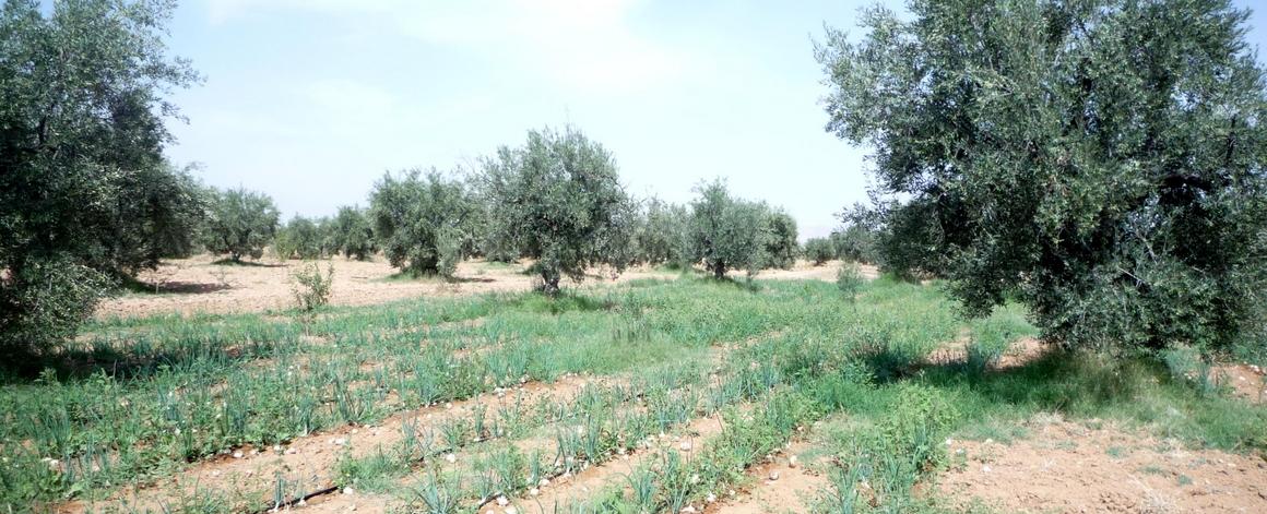 Culture d’oignons associée à des oliviers, dans la région de Sidi Bouzid en Tunisie. Une culture de productions variées est un facteur de la diversité de l'alimentation © S. Dury, Cirad