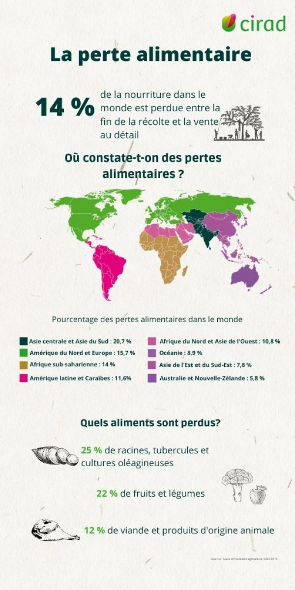 Les pertes et gaspillages alimentaires sont aussi un sujet phare de la stratégie du Cirad. Nos projets s’intéressent à la fois aux pertes post-récolte et au gaspillage alimentaire ainsi qu’à la valorisation des déchets : de la fourche à la poubelle.