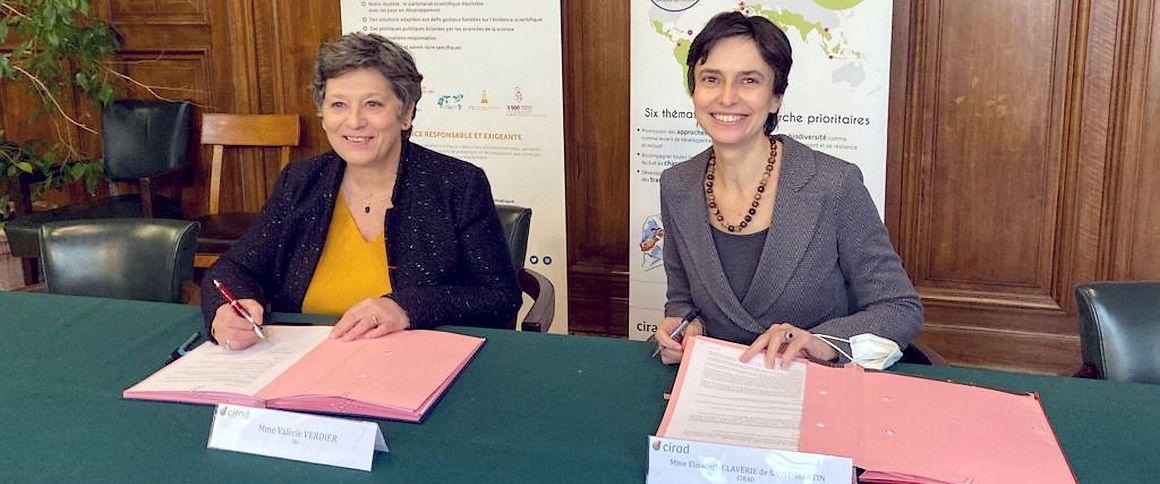 Élisabeth Claverie de Saint Martin, PDG du Cirad, et Valérie Verdier, PDG de l’IRD, renouvellent un accord-cadre pour 5 ans © K. Zerouali, IRD